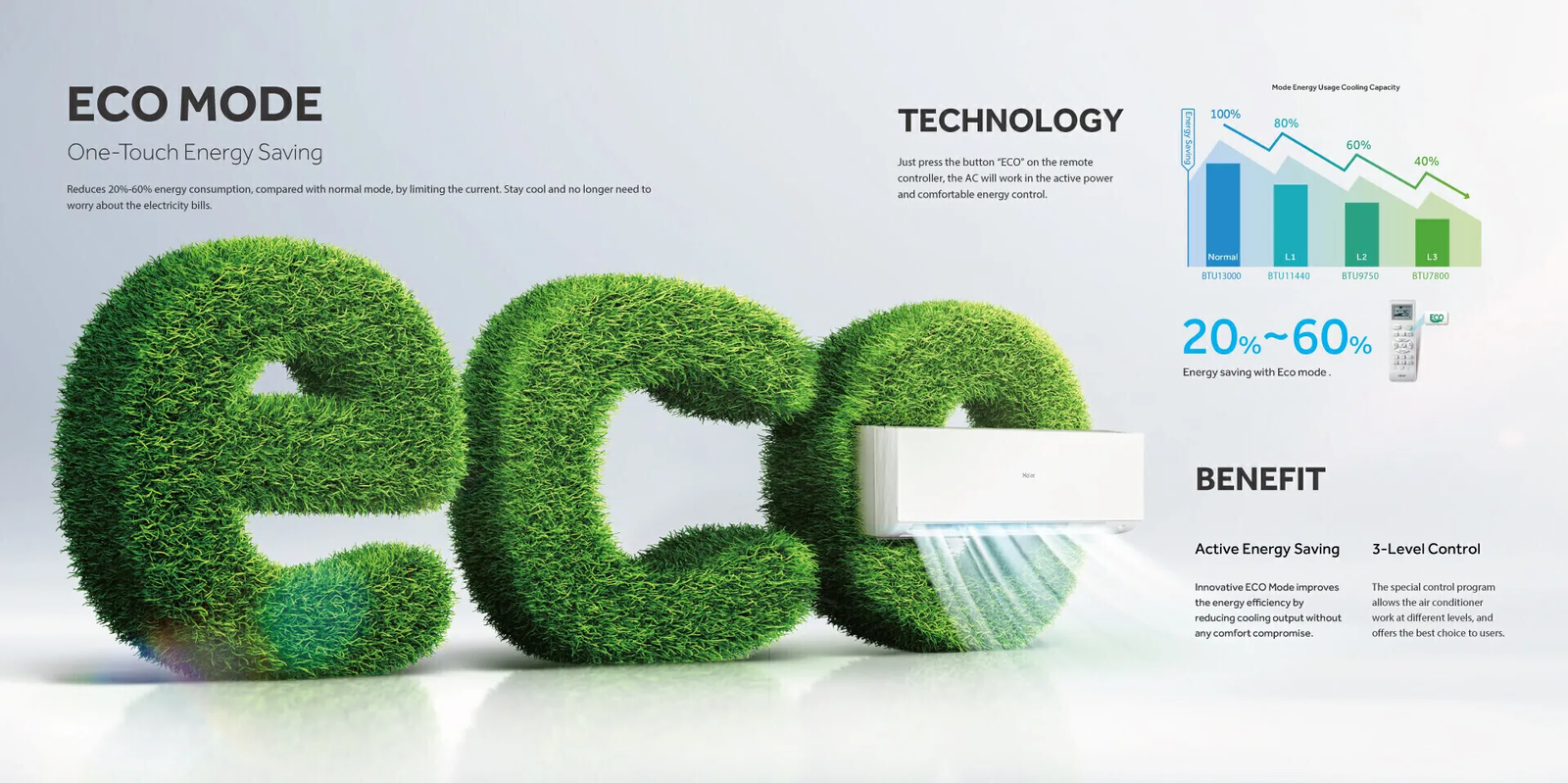 With a 1.6 ton cooling capacity and variable inverter operation, this Haier AC ensures fast and consistent cooling while significantly reducing electricity consumption. The powerful 5570W cooling capacity with a wide operating range adapts intelligently to room temperature, helping users save on monthly power bills. Its ECO mode further enhances energy efficiency, making it an ideal choice for long hours of daily use.