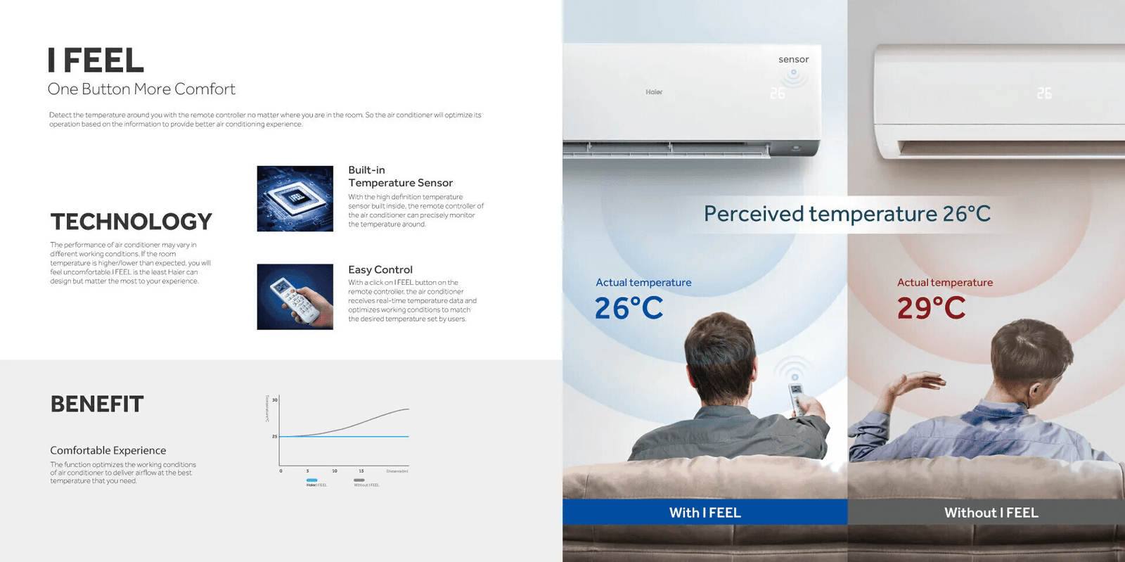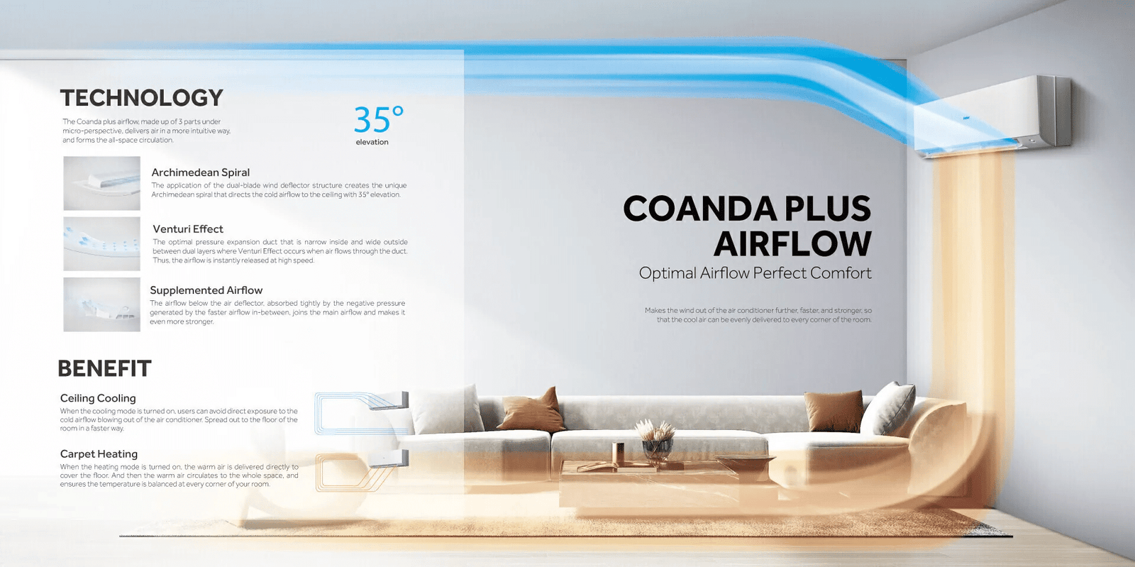 Equipped with Anti-Corrosion Technology, the Haier AntirustCool Pro is specially built to withstand Bangladesh’s coastal and high-humidity environments. The Self Clean Technology automatically removes dust, bacteria, and moisture from the indoor unit, ensuring healthier air and long-lasting performance. Advanced Coanda and 3D Airflow technology delivers uniform cooling across the room, while the iFeel feature senses temperature around the remote to maintain personalized comfort.