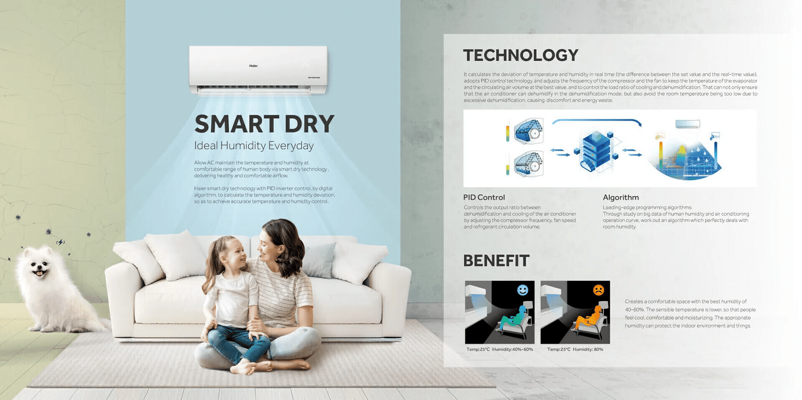This smart air conditioner supports Wi-Fi control via the HaiSmart App, allowing users to control temperature, modes, and timers directly from their smartphone. It also offers voice control through third-party assistants, adding convenience to everyday use. Additional features such as Turbo and Quiet Mode, Dry Mode, Sleep Mode, Auto Restart, Timer, Child Lock, and Automatic Error Detection ensure comfort, safety, and ease of operation.