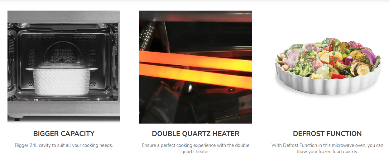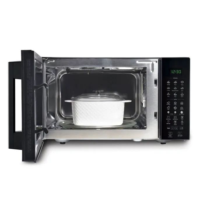 The Feather Touch Membrane Control Panel and LED display make operation smooth and convenient, while the Quick Start and Preheat functions help you save time during busy days. Its side swing door and 27 cm glass turntable provide easy access and even cooking results every time.