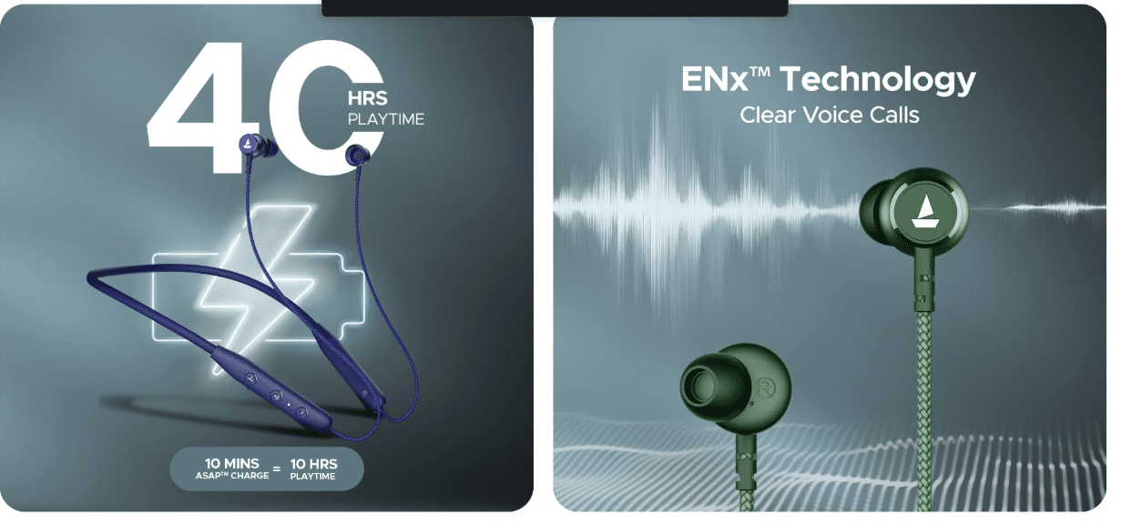The boAt Rockerz 110 delivers up to 40 hours of continuous playback, keeping your music, calls, and entertainment going all day long. With ASAP™ Charge technology, just 10 minutes of charging gives up to 10 hours of playtime, so you never have to wait long to get back to your tunes.