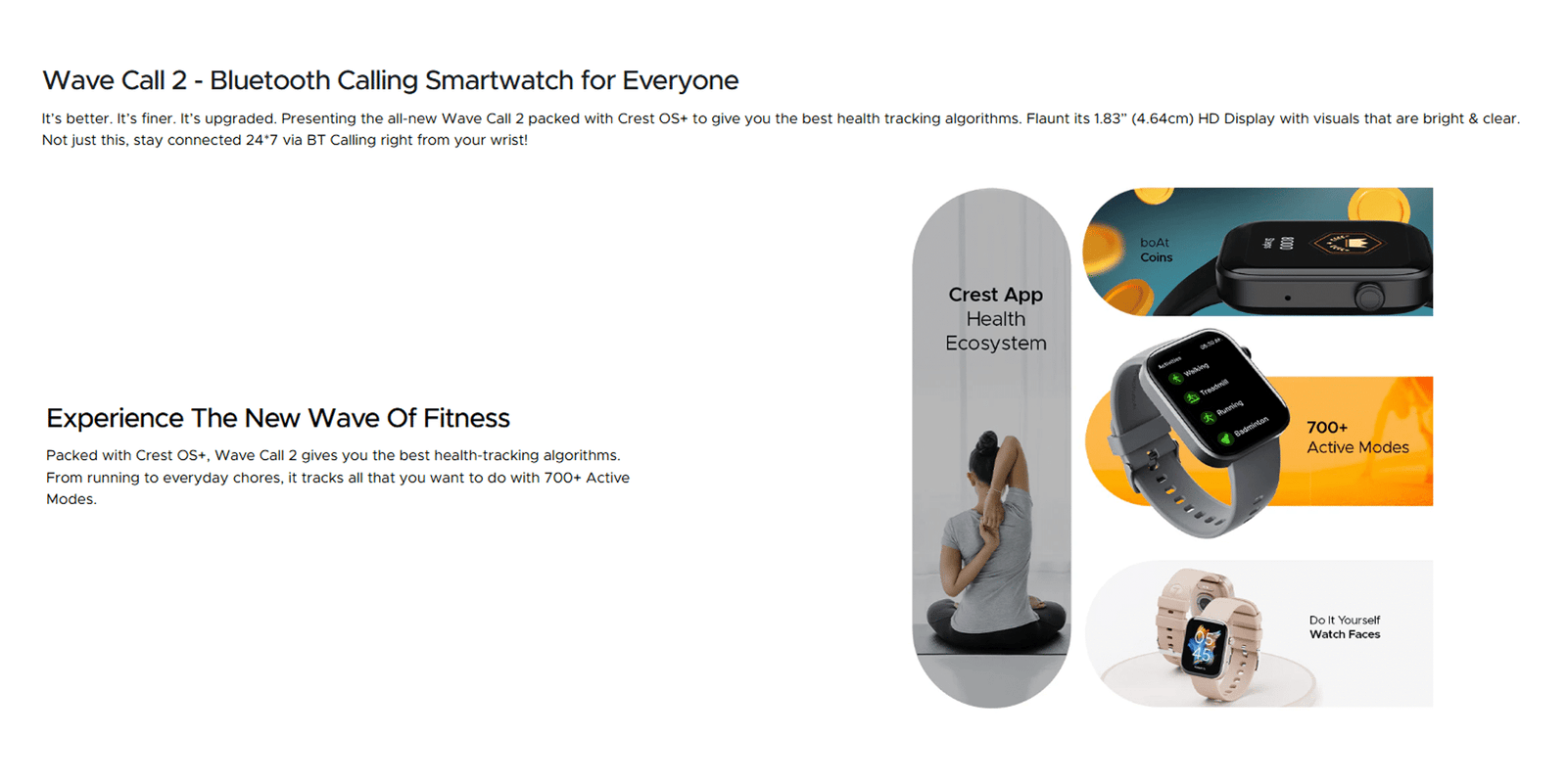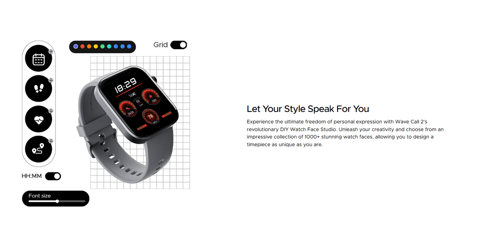 For fitness tracking, the boAt Wave Call 2 takes it to the next level with 700+ active modes, covering everything from running, cycling, and gym workouts to yoga, cricket, and more. Match your mood or style with 1000+ customizable watch faces, ensuring your smartwatch always looks fresh.