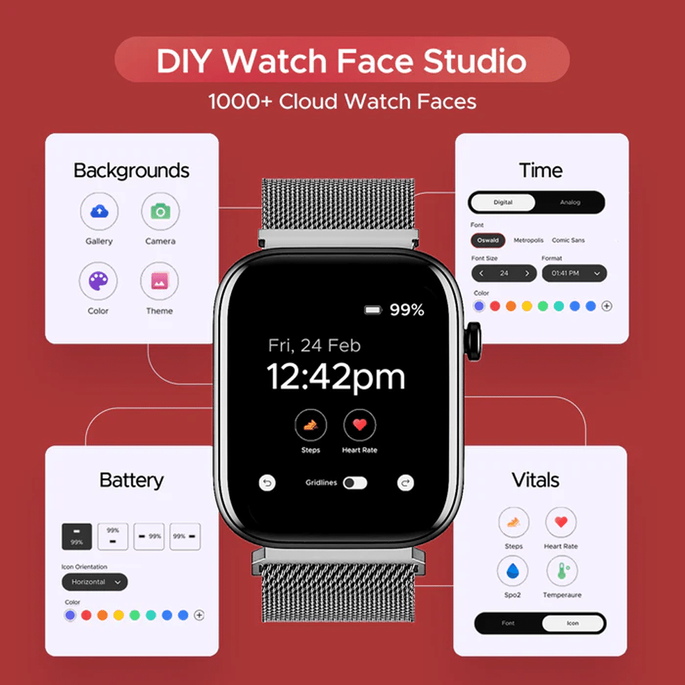 For fitness tracking, the boAt Wave Call 2 takes it to the next level with 700+ active modes, covering everything from running, cycling, and gym workouts to yoga, cricket, and more. Match your mood or style with 1000+ customizable watch faces, ensuring your smartwatch always looks fresh.