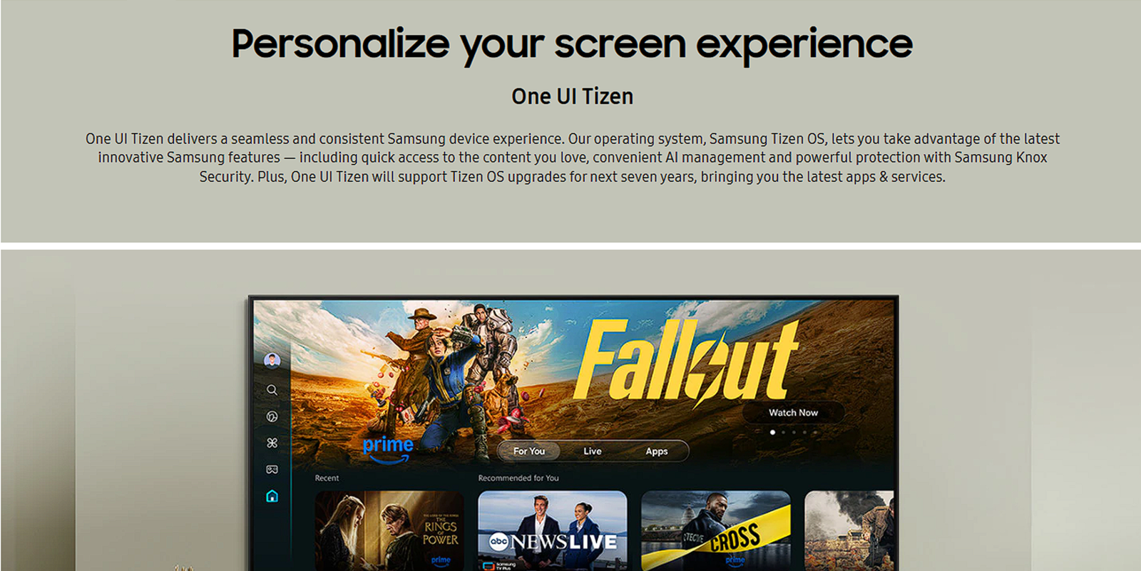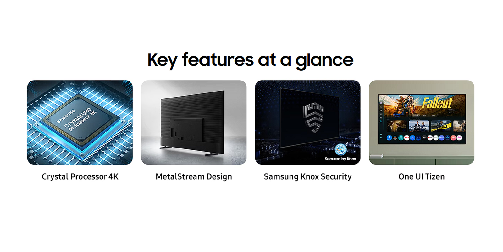 The Samsung 43U8510F runs on Samsung Tizen OS with One UI, offering a simple and intuitive interface to access streaming apps, live TV, and smart features. With Samsung Knox Security, your smart TV data remains protected, giving peace of mind for connected households.