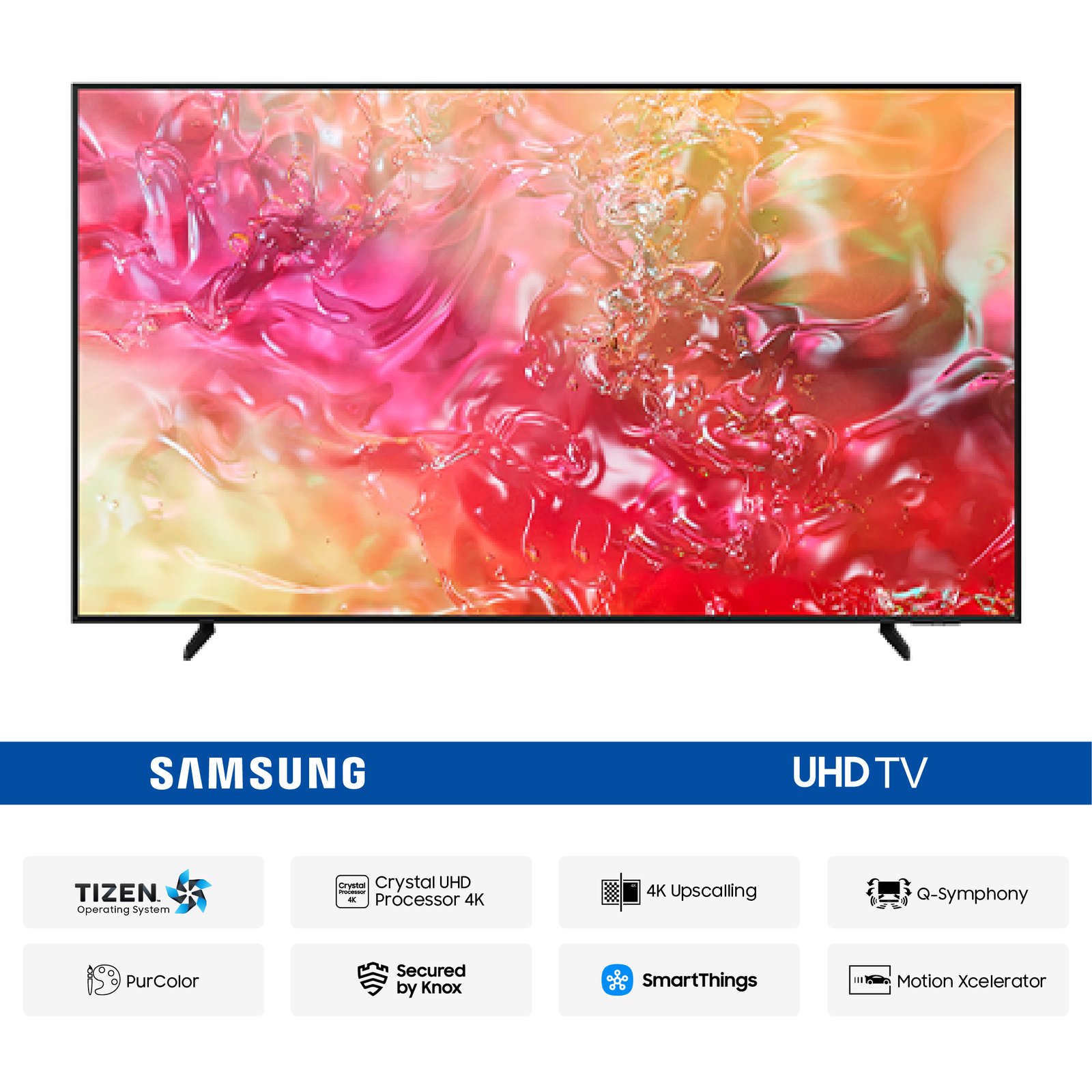 With UHD (4K) resolution, the Samsung DU7700 delivers crystal-clear visuals with impeccable detail and vivid colours. The PurColor Enabled Display ensures lifelike colours that make everything you watch appear more vibrant and realistic. Whether you’re watching movies, sports, or gaming, HDR (High Dynamic Range) enhances contrast and brightness for deeper blacks and brighter whites, delivering a more dynamic and immersive picture.